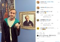 そんな人々の声を逆手に取ってか、530万人のフォロワーを誇る自身のインスタグラムに、「Agings a bitch」(年を取ったクソ野郎)というキャプション付きでトムが投稿したのは、額に飾られたドラコの写真を前に、後退した生え際をまるでケアせずにヘアを後ろにまとめ、白地にグレーの水玉のTシャツの上から同じような魔法使いのマントを着て写真を指差している自身の姿だ。
