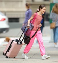 8月には、ブルーの装いのケイティが、ブルーのリールにブルーのベストを着たワンコを、ピンクの装いのスリが、ピンクのリールにピンクのベストを着たワンコをそれぞれ散歩させる様子がパパラッチされていたが、今回はリールカラーはそのままだが、ベストは1匹はスリとお揃いのペールピンク、もう1匹はショッキングピンクとピンクでコーデ。自分だけではなく愛犬のおしゃれも忘れないようだ。