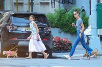 すっかり寒くなったニューヨークで、ポニーテールにサングラス姿の母ケイティ・ホームズは、白いスニーカー以外はパンツにシャツ、ダウンもオールブラックでポケットに手を入れているが、ヘアを後ろで束ねたスリは、茶のブーツに辛子色のスカートとペールピンクのウールコートにワインレッド系のマフラーとレザー手袋というおしゃれで防寒バッチリの装いで、ブルーとピンクのリールにつないだ2匹の愛犬をお散歩させていたようだ。