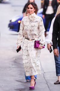 ヴィクトリアはロングヘアをルーズなポニーテールでまとめ、オフホワイトの生地に落書きのような文字が躍るツーピースで登場。もちろん、自身がデザイナー兼オーナーを務めるファッションブランドの作品だ。