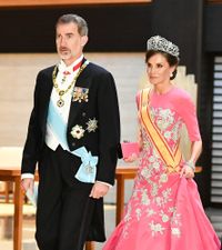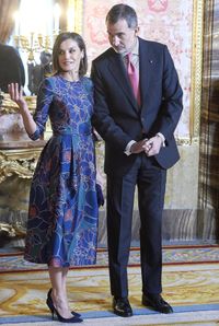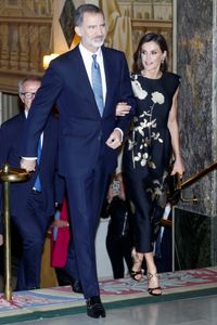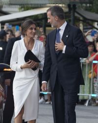 巻きスカート式のシンプルなグレーのAラインドレスに、黒い革のクラッチバッグとパンプス、イヤリングだけのミニマルなジュエリーだったが、裾を少しだけ遊ばせたストレートヘアのレティシア王妃の美しさは相変わらずだ。また夫婦コーデがお得意とあってフェリペ6世国王は、濃いめのグレーのスーツにペールピンクのワイシャツとブルーのネクタイというオシャレな出で立ちで授賞式に臨んだ。
