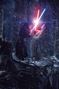 レイたちは、偶然乗り込んだ宇宙船ミレニアムファルコン号で、ハン・ソロとその相棒チューバッカと出会う。彼らはファースト・オーダーと戦っているレジスタンスと深い関わりを持っていた。ハンに連れられ、レイア率いるレジスタンスに加わった彼女は、悪の最高指導者スノークの右腕であるカイロ・レンが、実はハンとレイアの息子であり、ジェダイの修行中にダークサイドへ堕ちてしまったことを知る。レイは、ファースト・オーダーの基地破壊作戦に参加。父親のように慕っていたハンを戦いで失うが、レイはレンとの対決で、自身に秘めていた強大なフォースを目覚めさせる。
