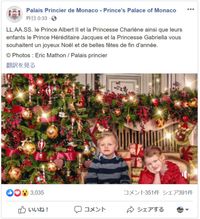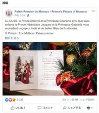 また、中の写真はツリーの横にアルベール2世大公と、天使のような白いドレス姿のガブリエラ公女が立っており、真っ赤なシャツドレスを着て座っているシャルレーヌ公妃の横には白黒の愛犬チワワ、白いシャツにベストを着たジャック公子がシャルレーヌ公妃の膝に座っている家族のショットで、背景が加工されて幻想的な雰囲気に仕上がっている。