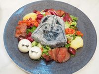 またボリュームたっぷりの「<ダース・ベイダー>深紅のローストビーフプレート」では、マッシュルームで表現されたストームトルーパーが可愛いアクセントに!さらに、ネーミングも楽しい「<BB-8>海老ービーエイト・グラタン」では、BB-8をモナカで表現。本カフェのメニューはすべてディズニーの栄養成分に関するガイドラインに適合し、塩分控えめの低糖質となっていることから、添えられたパンが減塩低糖質フランスパンなのも女性には嬉しいポイント。