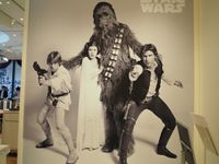 そんな本シリーズの貴重なコンセプトアートを使用し、ミュージアム形式となっている「スター・ウォーズ」OH MY CAFE。まずお店の入口では、ルーク・スカイウォーカー、レイア姫、チューバッカ、ハン・ソロが映し出された『スター・ウォーズ エピソード6/ジェダイの帰還』(83)の時の巨大パネルがお出迎え。長い歴史に想いを馳せつつ、「スター・ウォーズ」の世界へいざトリップ!