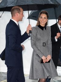あいにくの雨模様とあってか前髪とサイドを後ろでまとめたスッキリヘアにパールのクラスターイヤリングで、厳粛なセレモニーにキャサリン妃が選んだのは、もちろん英国ブランド。黒い襟とベルトがアクセントのキャサリン・ウォーカーのグレーのコートドレスに、黒い薄手のストッキングと黒いパンプス、黒いクラッチバッグと、いつもながらTPOをわきまえたシックでおしゃれな装いで、イギリスをしっかりサポート。