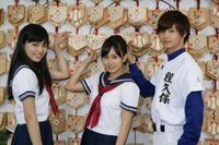 昔から勝負事の神様として参拝客も多く、“やきゅう”と名のつく神社であることから、野球関係者や、甲子園を目指す球児も多く参拝に訪れる箭弓稲荷神社。劇中衣装のセーラー服姿で登場した前田は、人生初となるヒット祈願のお祓いに終始緊張した表情をのぞかせ、ホームベース型の絵馬に「『もしドラ』が全国の皆さんに青春をお届けできますように」との思いを書き込んだ。瀬戸は絵馬に「ひたむきに大ヒット!!」と綴り、縁がないおみくじには「すごく影響されます。毎年、中吉のような微妙なものしか出ません。どうリアクションして良いのかわからないものばかり出ます」と苦笑い。絵馬を書くのは初めてとなった川口は、「もしドラが、たくさんの方に愛されますように…大ヒット」と書き込み、「絵馬を書くことによって願いが叶いそうです」と、笑顔をのぞかせた。