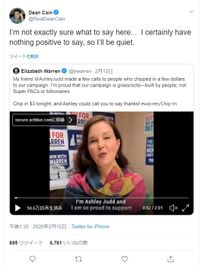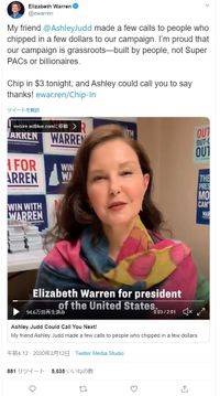 そんなアシュレイが、2月6日に自身の公式インスタグラムで、2020年の米大統領選で民主党から出馬を表明した学者で政治家のエリザベス・ウォーレンの支持を表明。またエリザベスの公式ツイッターでは、彼女を応援するよう訴えかけたビデオが公開された。