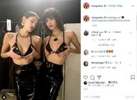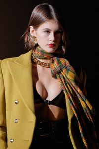 ショートボブに巨大なゴールドのイヤリング、赤い口紅のカイアがランウェイを歩いた際には、黒い光沢のあるラテックスブラとタイトスカートとブーツ、辛子色のジャケットを羽織った首にはチェーンと、茶と辛子色、赤のチェックのスカーフという装いだったが、自身のインスタグラムには、舞台裏で友人でモデルのミカ・アルガナラズ(27)とともに撮影した写真を投稿。2人ともジャケットは脱いでおり、両手で両胸を押さえて胸を寄せている、悩ましいショットだ。