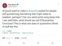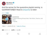 リタは、スウェーデンの企業スポティファイ・テクノロジーによって運営されている音楽ストリーミングサービスSpotifyと共同で、プレイリストを発信。その名もquarantine(隔離)にかけてQuarantunesだという。