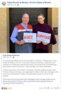 アルベール2世大公は水色のシャツに、赤、白、紺のベスト、シャルレーヌ公妃はアップにしたヘアスタイルにエンジのトップスという装いの2ショットをFacebookに投稿し、一致団結を訴えた。