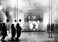 第一次大戦後に始まった大量生産、大量消費の時代の象徴である、超高層ビル群とそれらを照らすサーチライト。これがこの時代の人々が思い描いた未来都市だ。映画はその間を行く飛行機や高速道路を埋め尽くす自動車という、まさに現代の都市を予見していた。建物や内装のデザインは機能的でシンプルなものが多く、そしてどこか冷たい。