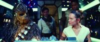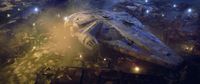 ベースとなったのは、旧型の貨物船YT-1300だが、歴代所有者が改造してきたため、見かけはオンボロだが銀河最速を誇り、ハン・ソロは「ケッセル・ランと呼ばれる危険なルートを約12パーセクで航行した」と豪語するほど。前の持ち主ランド・カルリジアンが2年かけて改造したものをソロがギャンブルで巻き上げた。前方部分が軽量シェルで覆われていた当時の形は『ハン・ソロスター・ウォーズ・ストーリー』で確認することができる。ハンが反乱同盟軍と行動を共にするようになってからはエピソード4の第1デス・スター攻撃などで活躍。エピソード6のエンドアの戦いではランドが操縦した。第2デス・スター侵入時に円形のアンテナが破損し、『フォースの覚醒』では長方形のアンテナに変わっていたが、『スカイウォーカーの夜明け』では再び円形アンテナに戻っている。