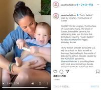 英国を拠点として、世界中の子どもたちや家族を支援する目的の慈善団体「Save the Children」の公式Instagramなどには、新型コロナウイルスのパンデミックに際し、これまでもヘレン・ミレンやニコラス・ホルト、ケイト・ウィンスレット、リヴ・タイラーなどのセレブが登場して絵本の読み聞かせを行う動画が投稿されている。ヘンリー王子とメーガン妃もその一環として、膝に乗せたアーチーに、メーガン妃が「Duck! Rabbit!」という絵本を読み聞かせる動画を投稿。ヘンリー王子が撮影したものだという。