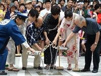 東野圭吾原作の加賀恭一郎シリーズ最新作を映画化した阿部寛主演『麒麟の翼 劇場版・新参者』(仮・2012年1月公開)。映画の舞台となった日本橋で、恒例の「橋洗い」イベントが開催され、映画のキャストである松坂桃李、菅田将暉、竹富聖花が、集まった1500人の人々と共に橋洗いを行った。