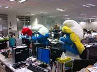 スマーフェットがバリバリ働くキャリアウーマンのように仕事をこなす一方、慣れない仕事に疲れてしまったパパスマーフは居眠りを始め、クラムジーは「もうやってらんねえ」と言わんばかりに仕事を放棄した。みんなのアイドル、スマーフェットは一人頑張るも、編集部員からスカートめくりの被害に遭い、長い鼻がチャームポイントのクラムジーとパパスマーフは、鼻を掴まれるなどオモチャにされる一幕もあったが、集合写真の撮影などを通じ、人間たちとの交流をはかった。