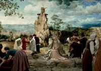ブリューゲルは、あのミケランジェロなどと同じく、16世紀に活躍した画家だが、その作品は同時代の画家たちと比べても独特なものばかりだ。農民の生活をモチーフとすることが多かったため“農民画家”と呼ばれることもあるが、彼自身は知識人サークルに属した教養人だったという。彼の作品は少し高い位置から俯瞰した地面の上に、雑然と人物たちを配置するといったものが多く、本作に登場する「十字架を担うキリスト」もその一例だ。