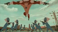 もちろん、排便シーンあり、ヒロインがアソコに何かを突っ込まれるシーンといった、ちょっと子供には見せられないシーンが続出。さらに“フロシキ”と呼ばれる突然変異種のお見事ともいうべき死にっぷりなどが、『マッドマックス』『マトリックス』『インディ・ジョーンズ』といった、そのタイトルを挙げていたらキリがないぐらいの有名作のパロディ満載で描かれる。