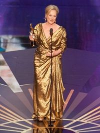 米テレビ番組インサイダーによれば、「妊娠中のメリルが、『ソフィーの選択』(82)で初めて主演女優賞を受賞した際に着ていたのは金色のドレスだった。金はまさにメリルにとって、アカデミー主演女優賞に臨む際の勝負色だ」そうで、メリルにも願掛けの意図があったのかもしれない。