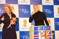 第84回アカデミー主演女優賞を受賞したメリル・ストリープが、受賞作『マーガレット・サッチャー 鉄の女の涙』(3月16日公開)を引っ下げてフィリダ・ロイド監督と来日。3月7日に六本木のザ・リッツ・カールトンで来日記者会見を開催した。メリルと監督は大ヒットを祈願して鏡開きをし、ふたりはそのお酒をペロリとなめて笑顔を見せた。