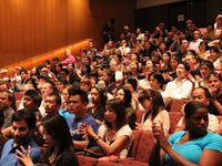 舞台に上がった小橋監督の第一声は「ワオー!」というものだったが、初監督作にして、ドキュメンタリー映画であるにも関わらず、226席の観客席はほぼ満席。しかもアメリカ人が多かったから無理もない。渡米経験を生かし、「週末でもないのに、こんなにたくさんの人が来てくれてびっくりしました」と流暢な英語で語ると、会場は大きな拍手に包まれた。