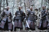 見どころは、映画の中盤で描かれる一人VS複数の無制限耐久チェイス。その中で、一際目を引くのが、前述の走って追いかけてくる弓士集団なのだ。この10人の集団、どいつもこいつもワイルドでマッチョな男ばかり。獰猛な獣ともいうべき男臭い面々だが、意外にも愛らしい髪型をしている。いわいる弁髪スタイルで、後ろ髪は伸ばしつつも、前頭部は基本的に坊主。なかには前髪を伸ばす者や、モヒカン風に髪を残す者もいて、随分と個性的だ。そんな彼らが追ってくる姿は、想像だけでも、かなり迫力があって、暑苦しいことがわかるだろう。
