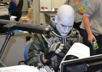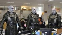 そして到着したタイラント3体は興味深そうに編集部内を見回し、まずはうろうろと徘徊。その後、さもここが自分のデスクだとばかりに着席し、仕事を始めるではないか。資料のチェックやパソコンを操作、さらには電話応対などにかかるのだが、そこはさすが暴君タイラント。資料の文字が読めないのか、無造作に放り投げるわ、パソコンの画面を叩き出すわ、もうやりたい放題。すぐに飽きてしまったタイラントたちは仕事を放棄し、今度はまたもやオフィス内をうろうろ、うろうろ。タイラントもやはり男なのか、女性編集部員にスキンシップを求めたり、何気にいかつい顔をしていながら、可愛いところもあるのだった。最後には集合写真の撮影にも快く応じるなど、編集部員たちとの交流を図った。