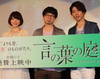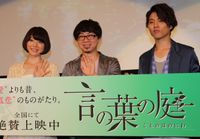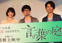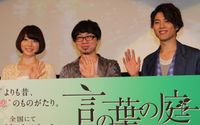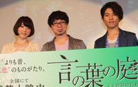 国内外で高い評価を受けるアニメーション作家・新海誠最新作『言の葉の庭』。公開記念舞台挨拶が6月1日に新宿バルト9で開催され、新海監督と共に、声優を務めた入野自由、花澤香菜が登壇。新海監督は「一切の言い訳をせずに、皆さんに届けられる作品にしたいと思い、作り続けた作品です」と万感の思いを語った。