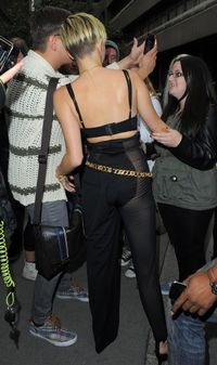 同ミュージックビデオの裸と涙について、「悲しいから脱いだのよ。実際の涙以上に、私の心は孤独で悲しいの」と語ったマイリーは、大胆な行動と、パパラッチから隠れるようなシャイな行動を繰り返してきたが、今度は、黒いサングラスに流行りの黒ブラ、ハイウエストの黒いズボンといういでたちでロンドンの街に登場。右半分は黒い透き通ったタイトなズボン、左半分は、陰部をカバーする幅の黒い光沢のある布地という左右対称な一風変わったパンツ姿で、「ジャンポール・ゴルチエのデザインを尊重し、下着はつけていない」と語ったと、Usウィークリー誌が写真付きで報じている。