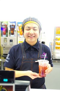 次に、フードやドリンクを販売するコンセッションへ。「いらっしゃいませ!」と一際大きな声を発し働く中川さんに意気込みを聞くと「来てくださったお客様を笑顔で迎えたい。その気持ちを一番大事にしています!」と、溌剌とした声で答えてくれた。写真にある、手に持っているのは一押しメニューのフレーバーソーダ。イオンシネマ、オリジナルのこのドリンク、女性をターゲットに開発したそうだが、男性や子どもにも大人気だという。