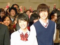 剛力彩芽が映画初主演を務めた青春ラブストーリー『L・DK』(4月12日公開)が、ラジオ番組とコラボした公開収録イベントを開催。会場に現れた剛力と共演の山崎賢人は、映画と同じ制服姿で登場し、300人の来場者を前にドキドキのシーンを再現する特別授業を繰り広げた。