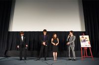 舞台挨拶で、まず沖縄の印象を聞かれた一同。映画祭への参加は3度目という平は、「海がキレイ!沖縄の人は、初めて会った時から温かい人ばかり。そんな人たちと島全体で大きなことを一緒にできるのがうれしいです」と力説。青柳は「帰る日が近づくにつれて帰りたくなくなるんですよね。でも、明日帰るんです…」と、寂しげにポツリ。松田は「映画祭には初回から参加しているので今回で6回目。夜は久茂地(くもじ。飲食店が集まる那覇市の地名)あたりをウロウロしています」とアピールした。