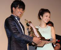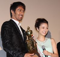 会場からの拍手が多い人が優勝となるが、圧倒的に票を集めたのは上戸だった。上戸は「本当に嬉しい!」と大きな笑顔。本作では混浴シーンにもチャレンジしているが、「混浴シーンの前に、『絶対に背中をきれいに鍛えてやる』と思って、ブルガリアの撮影にジムグッズを持っていったんです。でもブルガリアのジムでは、必ず誰か“濃い顔”の方が体を鍛えていて。阿部さんは常にいるし、みんなでマシンの取り合いだった」と暴露。