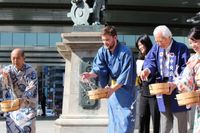 その後、今年で6回目の実施となる“打ち水大作戦”に参加。ハリウッド映画の出演者が参加するのは今回が初めてのことだ。レイナーは矢田美英中央区長や浴衣女性らと打ち水を行い、36度の気温を34.5度に下げることに成功。感想を聞かれたレイナーは「すばらしいイベントだね!精神的にも清められた気がするよ(笑)」と終始笑顔で日本の伝統行事を楽しんでいた。
