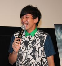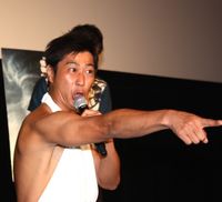 続いて、同じシーンに男性役としてトライすることになった尾形は、「ヨイショー!」と女性役の菅をお姫様抱っこし、「尾形竜巻ー!ラブホテルに避難だー!」と絶叫。迫力ある映画を見終わった観客は少々お疲れ気味だったのか、懸命にやる気を見せる尾形に反して会場からは静寂の後に失笑がもれ、尾形も「今、台風の目に入りましたか!?」と汗をかいていてた。