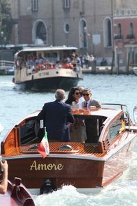 ジョージはシルバーのスーツにネクタイ姿にサングラス、アマルはイタリアン人デザイナーのジャンバティスタ・バリの白に花柄のドレス姿にサングラス姿で、“Amore”と刻まれた水上タクシーに乗り込み、ゲストがサンデーブランチを楽しむホテル・チプリアーニへと向った。ジョージはアマルを大切そうにエスコートし、愛おしそうに見つめ合いながら、終始笑顔で幸せいっぱいのふたりの様子がデイリー・メール紙などに掲載されている。