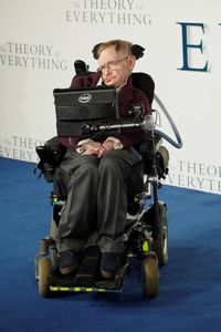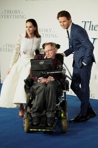 UKプレミアでの3ショット。左からフェリシティ・ジョーンズ、ホーキング博士、エディ・レッドメイン 写真:SPLASH/アフロ