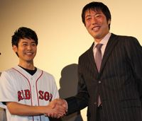 最後には、上原投手からサイン入りユニフォームをプレゼントされた妻夫木。早速ユニフォームに袖を通すと「でかい!僕、小学生みたいじゃない?」とサイズの大きさに驚きながら大はしゃぎ。その後行われた囲み取材でも「いまだに緊張して目を見られない」と照れ笑いで、一方の上原は「顔、小さいなあ。うらやましい」と妻夫木の印象を語っていた。【取材・文/成田おり枝】