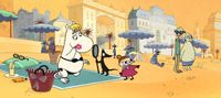 一方のムーミンは、贅沢な暮らしに馴染めず、ムーミンママと一緒にホテルを抜け出す。ガールフレンドのフローレンを気にしつつも、クラークに現を抜かしている彼女にイライラ。大胆な水着でイイ女度上げようとするをフローレンに、「何も着てないみたい…」と、小言もチクリ。最終的には、ライバルのクラークに決闘を申し込むなど、男としての意地も見せる。簡単には引き下がらないムーミンのこんな表情は見たことないかも!?