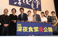 映画『深夜食堂』の初日舞台挨拶が1月31日に丸の内TOEIで開催され、小林薫、高岡早紀、柄本時生、多部未華子、筒井道隆、菊池亜希子、オダギリジョー、松岡錠司監督が登壇。TVドラマから映画化が叶い、満員の会場を見渡した小林が「大吉を引き当てた思い」と感慨深い表情を見せた。
