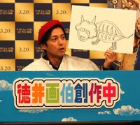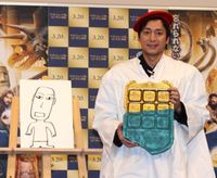 特徴的な絵を描くことから、皮肉を交え“画伯”とも呼ばれている徳井。その後は、「トリケラトプスの骨格標本」「スフィンクス」「モアイ」とお題が出され、イラスト描きに挑戦。描いたスフィンクスは「僕の中では革命的な絵。正面からネコ科を描いたのは初めて」と胸を張り、記者から「人生最大の傑作?」と聞かれると「そう言っても過言ではない」と断言。しかしながらその微妙な仕上がりに会場からは失笑がもれ、徳井は「映画のイメージダウンにならなければいいな」と心配していた。【取材・文/成田おり枝】