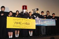 宮部みゆきの同名小説を2部作として映画化した『ソロモンの偽証 前篇・事件』(3月7日公開)、『ソロモンの偽証 後篇・裁判』(4月11日公開)の“前後篇イッキ魅上映イベント”が3月1日に新宿ピカデリーで開催され、藤野涼子、板垣瑞生、石井杏奈、清水尋也、富田望生、前田航基、望月歩、成島出監督が登壇。ステージでは映画盗撮防止啓蒙キャンペーンのキャラクター・カメラ男が乱入し、パトランプ男とダンスパフォーマンスを披露した。
