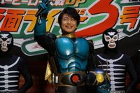 仮面ライダー3号のライダースーツに身を包み、劇場ロビーのらせん階段から姿を現した及川。すっかり3号ライダーに成り切っている様子で「このスーツを着ると、ミッチーではいられない」と終始、興奮気味。観客の声援に応えるように決めポーズも披露したが、その着心地については「とにかく暑い。10分で汗が吹き出してしまいますね」と苦労も口にし、会場の笑いを誘っていた。