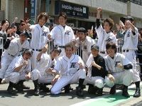 毎回、大いに盛り上がる『ROOKIES 卒業』(5月30日公開)関連のイベント。4月29日には、市原隼人らが、舞台となった二子玉川の商店街で凱旋パレードを開催。その後、彼ら二子玉川学園高校(通称ニコガク)のメンバーたちと、地元の少年野球チームとの交流試合が行われた。