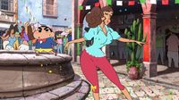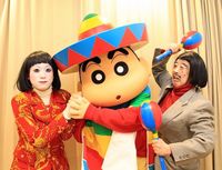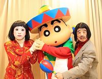 白塗りの朱美ちゃんに扮した橋本も「むちゃくちゃうれしくて。甥っ子姪っ子にも話したら、大喜び。一気にスターになりました」と今回の抜擢に大喜び。アニメとなった朱美ちゃんについては「自分たちがしんちゃんの世界にいるんですもの。それに、足を細く描いてもらってとってもうれしい」とその出来栄えに感激しきりだった。