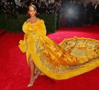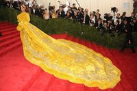 リアーナが着ていたのは、中国人デザイナー、グオ・ペイの黄色いドレス。あまりに長く伸びた裾が、他の人の踏み場もないほどに美術館の階段いっぱいに広がり、「オムレツにしか見えない」として、フライパンの上に乗ったリアーナや、広がった裾をピザの下地に見立てて、上にチーズやトマトなどの具を乗せたコラ画像がネット上を飛び交った。