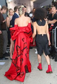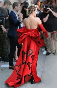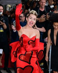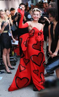 マイリーは『紳士は金髪がお好き』(53)でマリリン・モンローが着ていたイヴニングドレスを思わせるグラマラスな赤いドレスにサテンのロンググローブを着けて現れた。ドレスには大型のハートがあしらわれていて遊び心が感じられるものの、露出度の高い奇抜な格好の多いマイリーにしては上品な装いだった。