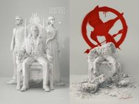 そして新ビジュアルは、独裁国家の権力者、スノー大統領(ドナルド・サザーランド)の像がバラバラになり背後の壁には革命のシンボル“マネシカケス”が描かれたもの。『~レジスタンス』公開前に到着したものと大きく印象が異なり、激しい闘いを予感させる。
