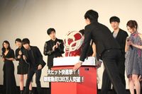 MCから、8月12日にフィリピンで封切られて日本映画史上最高のスタートを記録、さらに8月13日には香港のデイリーランキングで1位を獲得したと発表され、会場からは大拍手が起こった。世界的な成功を祝して、8月15日(土)からスタートするdTVオリジナルドラマ「進撃の巨人 ATTACK ON TITAN 反撃の狼煙」に出演している平岡祐太がサプライズ登場。幅60cm×高さ60cmの“巨人ケーキ”を携えての登場に、登壇者の視線を釘づけにした。