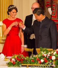 訪英中の中国の習近平国家主席を招いてバッキンガム宮殿で行われた晩餐会で、キャサリン妃がエリザベス女王と共にトップテーブルと呼ばれる上座中央のテーブルに座り、真っ赤なドレス姿で人々を魅了した。